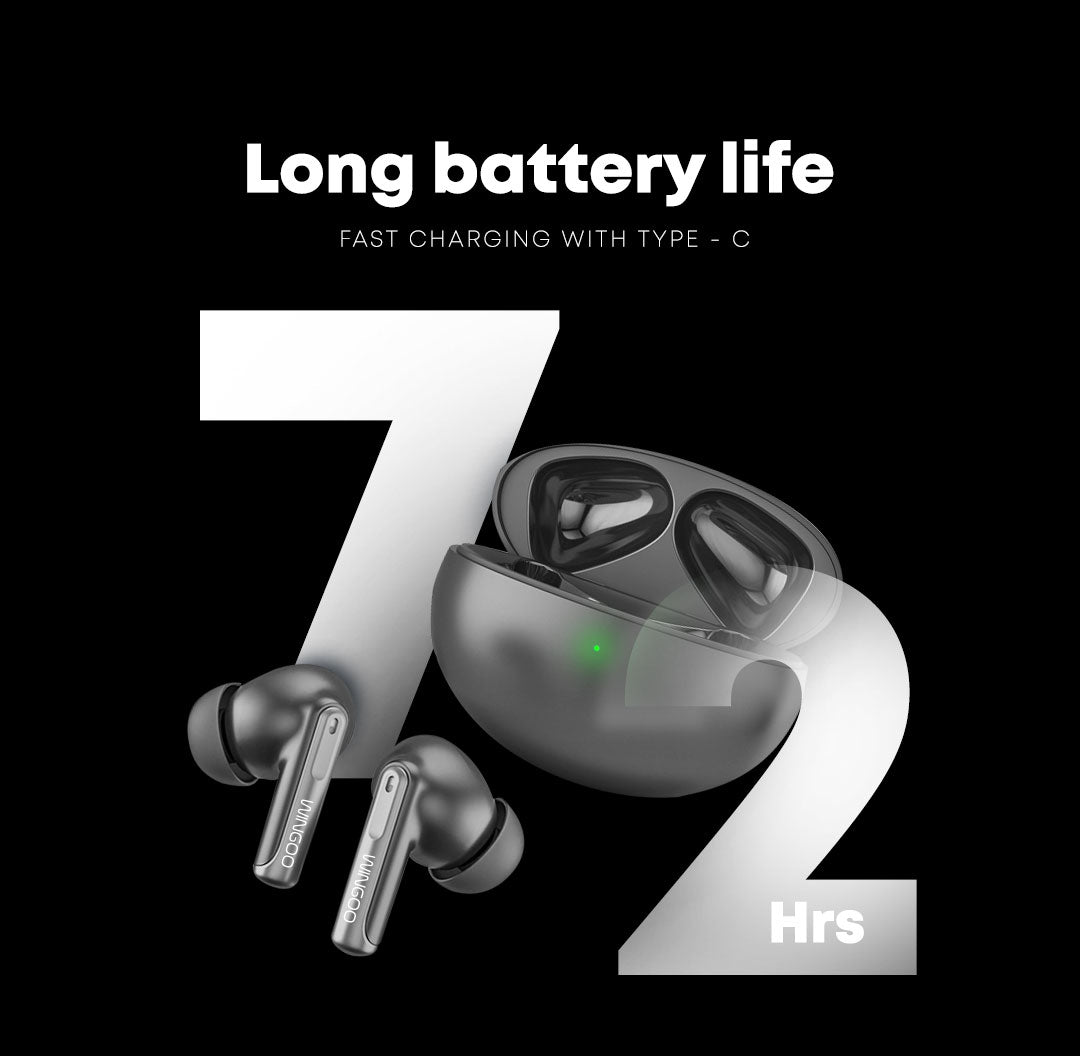 Wingoo iBuds provide up to 72 hours of continuous playback. With regular use, the battery can last more than 7 days.